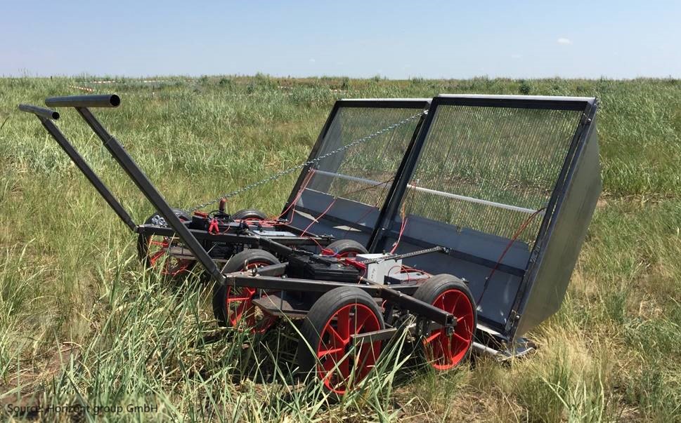 This first electric grid prototype was constructed specifically to conduct small scale experiments in the field and assess the efficiency to eliminate locusts at an early stage.